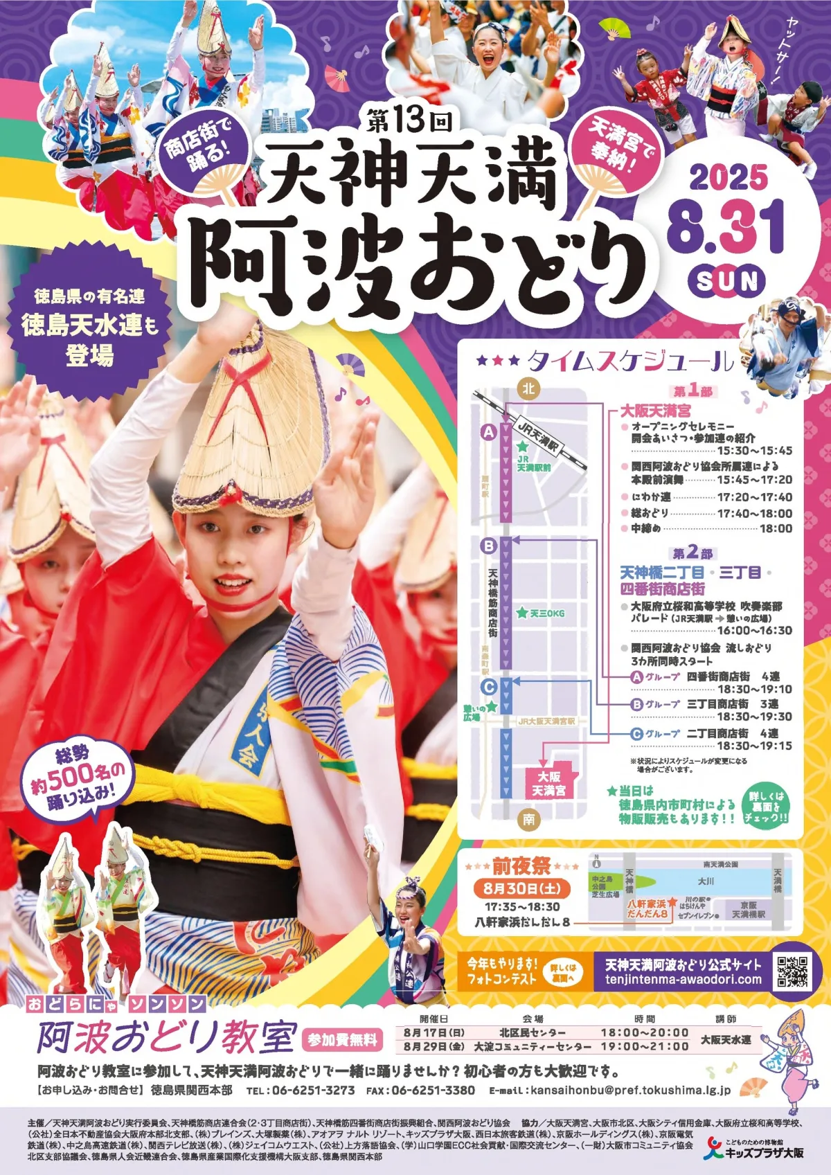 関西圏で最大規模を誇る阿波おどりイベント、「天神天満阿波おどり」が2025年8月30日と31日に開催されます。商店街の名所「天神橋筋商店街」と、日本三大祭りに数えられる「大阪天満宮」が舞台となり、伝統の阿波おどりの熱気に包まれます!