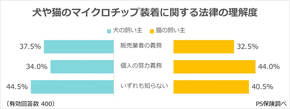 - - 犬の飼い主:44.5%が「いずれも知らない」と回答し、次いで37.5%が「販売業者の義務」、34.0%が「個人の努力義務」を認識していました。