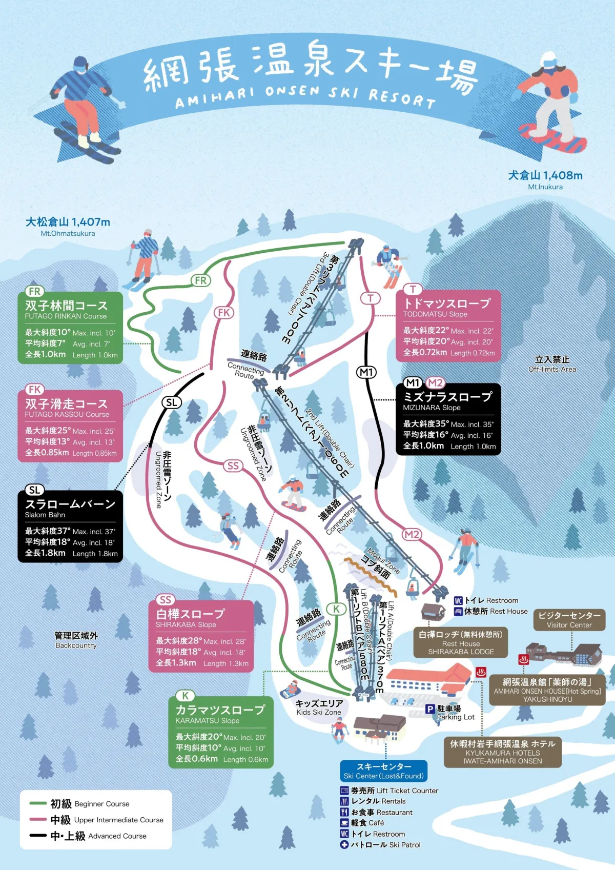 「網張温泉スキー場」は、最大斜度35度、最長1kmのダウンヒルコースをはじめ、ネットで仕切られたキッズパークも完備されています。初心者からエキスパートまで、さまざまなスキーヤーに対応したコースが用意されているため、家族連れや友人同士で楽しむことができます。スキーセンターには、レストランやレンタルコーナー、SAJ・JSBA公認のスキー学校もあり、どなたでも安心してスキーを楽しむことができます。