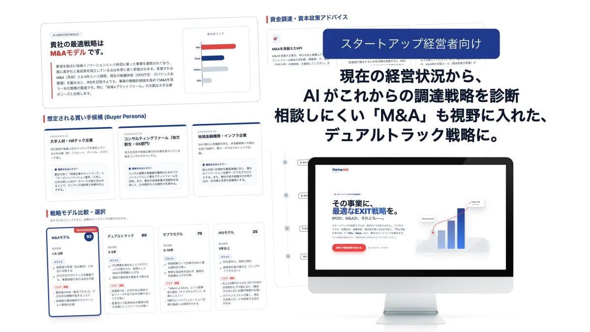 「Startup EXIT AI NAVI」は、資金調達環境の変化に対応し、IPOとM&Aを並行して検討する“デュアルトラック”の視点で企業の成長戦略をAIによって可視化・設計するサービスです。詳細な情報は、