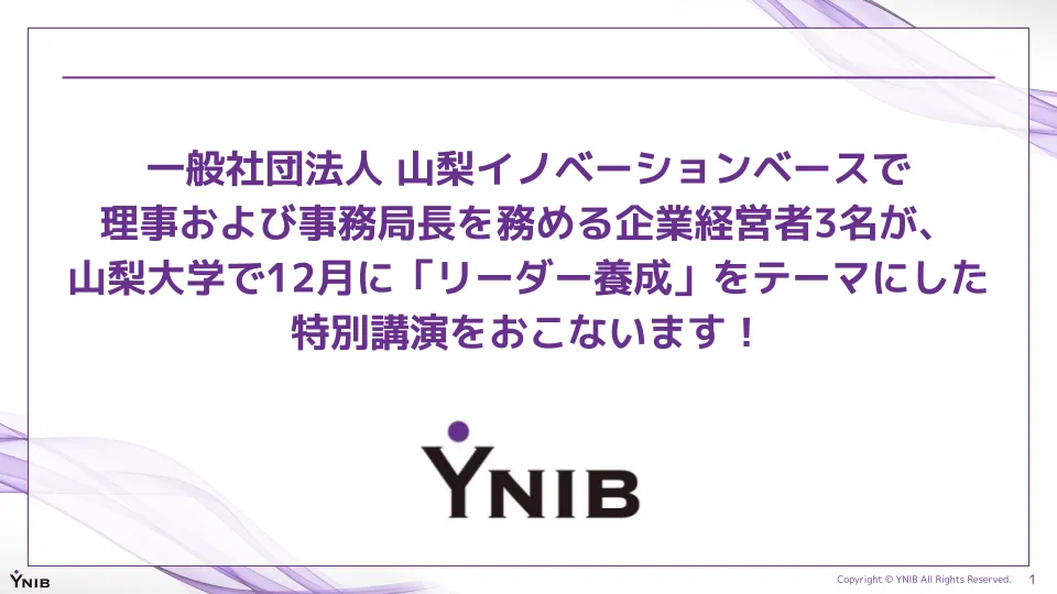一般社団法人山梨イノベーションベース(YNIB)に所属する企業経営者3名が、山梨大学において「リーダー養成」をテーマにした特別講演を行うことが決まりました。この講演は、山梨にゆかりのある起業家たちによる若手アントレプレナーの支援を目的としています。特別講演は、2024年12月の12日、19日、26日に実施され、それぞれ異なるテーマが設けられています。