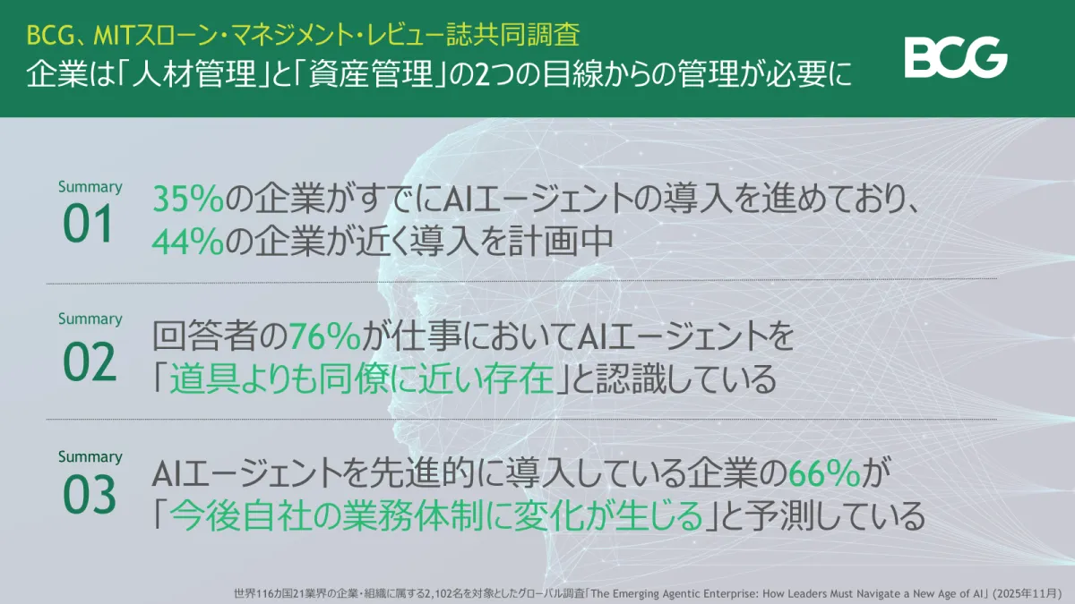 AIエージェントの導入に伴い、企業は資産管理と人材管理の両方における新たな管理の課題に直面しています。BCGのマネージング・ディレクターであるShervin Khodabandeh氏は「AIエージェントは既存のビジネスプロセスを根本的に変える力を持っている」と述べ、成功する組織は単にAIを導入するだけでなく、プロセス自体を再構築する必要があることを強調しています。