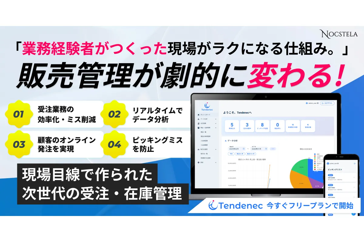 ノクステラ株式会社が正式にリリースした「Tendenec」は、業務を現場に即した形で管理できる次世代の販売管理SaaSです。受注や在庫の管理をより効率的に行うことができ、営業提案や経営判断を立てるための信頼性の高いデータを提供します。