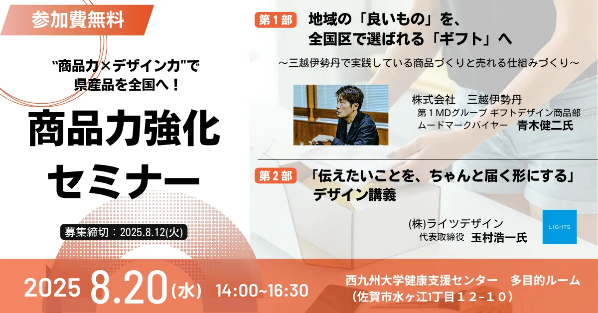 佐賀県産品流通デザイン公社では、2025年8月20日(水)に『商品力強化セミナー』を開催します。このセミナーは、県内事業者の販路拡大を支援する目的で、首都圏の現役バイヤーやデザイナーを講師として迎えます。