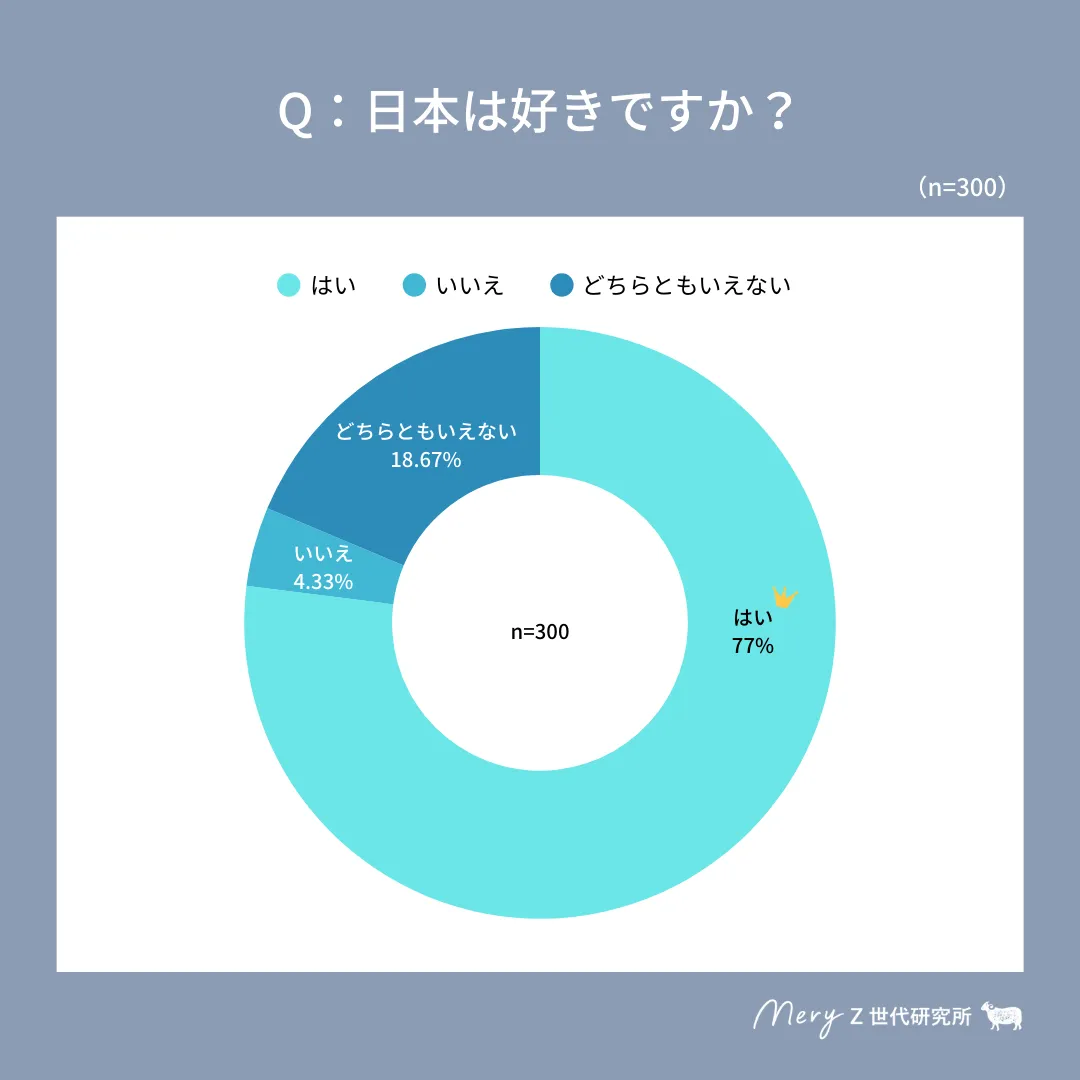 株式会社MERYが実施した最新の調査によると、Z世代(15歳〜29歳)の約8割が「日本が好き」と感じていることが明らかになりました。この調査は、Z世代の価値観や行動を理解するために定期的に行われるもので、今回の結果はその一部を示しています。