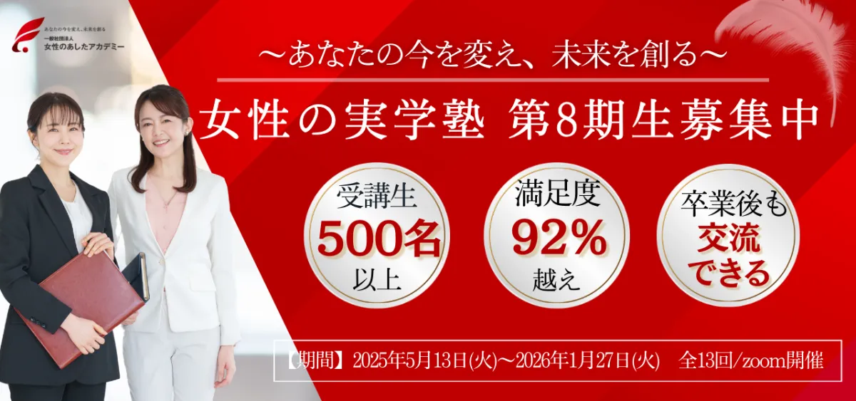 一般社団法人女性のあしたアカデミーが主催する「女性の実学塾」は、ライフイベントとキャリアの両立に悩む30代後半から50代を対象にした実践型プログラムです。2025年5月から始まる第8期の受講生を現在募集中です。