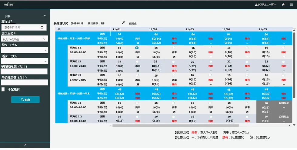 「SST便」は、富士通の「Fujitsu Unified Logistics」によるデータ基盤を活用しています。これは、荷主企業が出荷計画や荷物量、梱包状態などの情報を入力し、物流事業者の運行計画と照合することで最適な輸配送計画を作成します。荷主企業は新たなパートナーを探す手間なく、効率的な輸送を実現することができるのです。