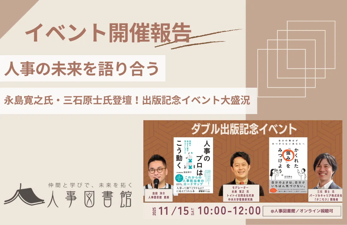 2025年11月15日、東京都中央区に位置する人事図書館で、『かくれた「強み」をみつけよう。』と『人事のプロはこう動く』の出版を記念した共同イベントが開催されました。このイベントは、株式会社Trustyyleの代表取締役である吉田洋介氏と、パーソルキャリア株式会社の三石原士氏を著者に迎え、モデレーターに永島寛之氏を迎えて行われました。イベントは参加者の盛況の中で終了しました。