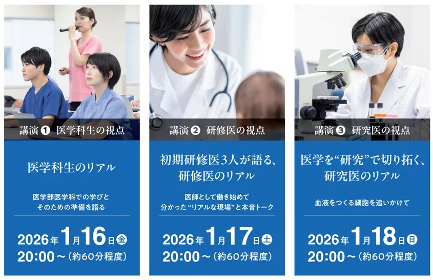 このオンライン講演会は2026年1月16日(金)から1月18日(日)にかけて行われ、医師を志望する中学3年生や高校1年生(新高2生)を対象としています。参加は無料ですが、定員に限りがあるため早めの申し込みが推奨されています。申し込みはウェブフォームから行うことができ、先着順での受付となります。
