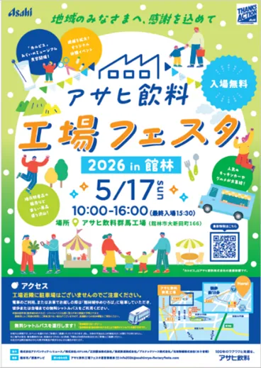 5月17日、群馬県館林市にあるアサヒ飲料株式会社の群馬工場で、「アサヒ飲料 工場フェスタ」が開催されます。このイベントは、工場を一般に開放し、地域の人々との交流を図ることを目的としています。今年はシステム障害からの復旧を感謝する「THANKS ACTION」の一環として、例年よりも内容を充実させた形で実施されます。
