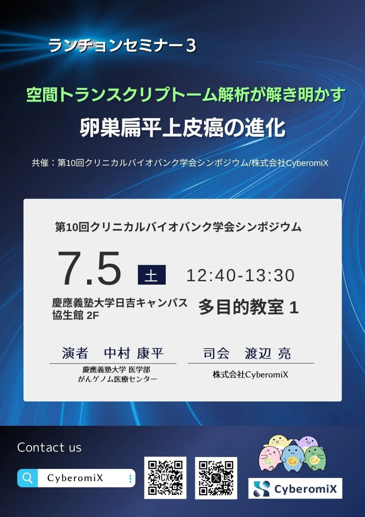 特に注目すべきは、株式会社CyberomiXによるランチョンセミナーです。司会はCyberomiXの渡邊亮氏が務め、専門家である中村康平先生(慶應義塾大学医学部がんゲノム医療センター)を迎えます。