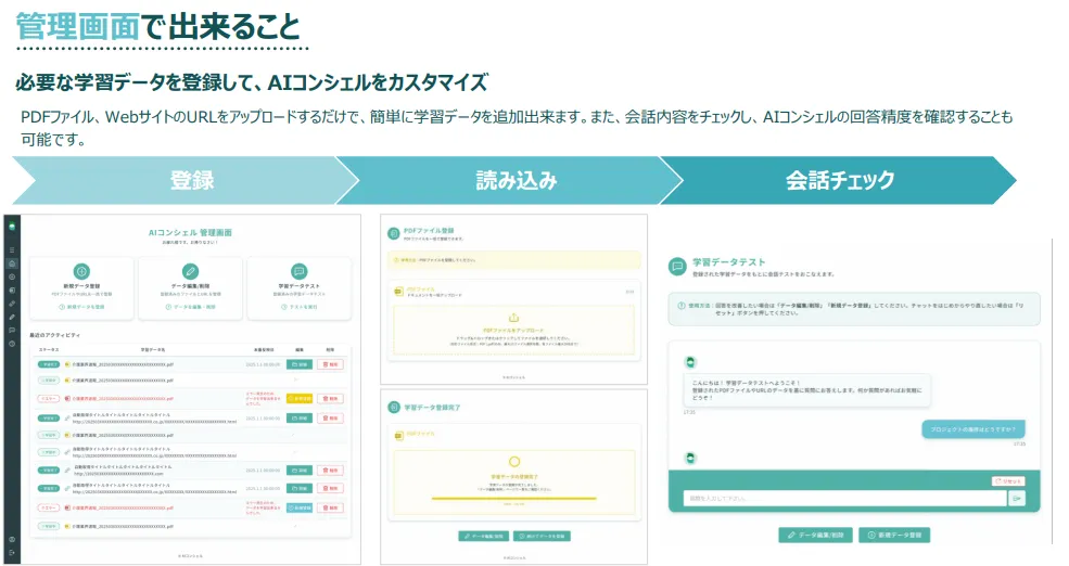 新機能を使えば、顧客は専用のデータ更新管理画面から自社が必要な情報を更新できるため、これまでのような専門知識やデータ加工の手間が不要になります。具体的には、顧客がPDFファイルやウェブサイトのURLを指定するだけで、システムが自動的にデータを抽出し、AIが学習可能な形式に整備します。この運用の簡便さにより、AIの最新情報をいつでも反映させることが可能になります。
