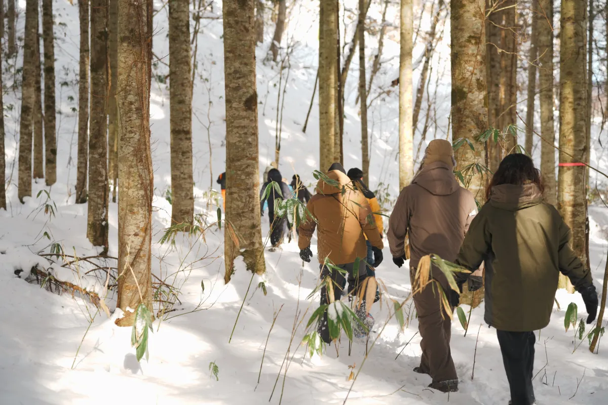 2日目にはスノーシューを履いて冬の山に入ります。現役の猟師や自然活動家と共に静寂な森の中を探索し、熊の野生の気配を感じました。参加者たちは、雪の上に残された爪跡や熊の通り道を観察し、自然とどのように向き合うかを考える貴重な体験をしました。