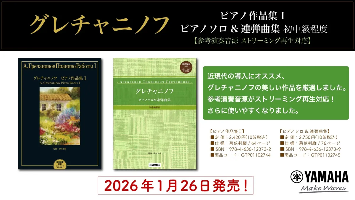 新たに発表される「グレチャニノフ ピアノ作品集 I」及び「グレチャニノフ ピアノソロ&連弾曲集 初中級程度」は、ヤマハミュージックエンタテインメントホールディングスからリリースされます。どちらの楽譜集も、ストリーミング再生に対応した参考演奏音源が付属しており、よりアクセスしやすくなっています。