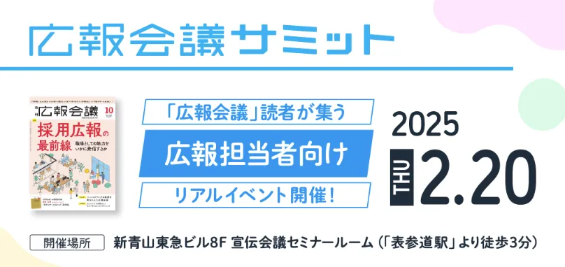 株式会社宣伝会議は、広報業界のスマートな進化を受けた最新トレンドを学ぶイベント「広報会議サミット2025」を2025年2月20日(木)に開催します。このイベントは、広報業界に身を置く皆様にとって、今後の業務に役立つ貴重な知見を得られる貴重な機会です。参加は無料で、事前登録が必要となります。