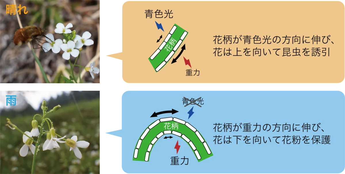 Arabidopsis hallerisubsp. gemmifera)という植物です。この植物は晴れた日には花が上向き、雨の日には下向くという特徴があります。晴天時に花が上を向くのは、花柄(茎の部分)が青色光の方向に伸びるためです。この向きは昆虫を引き寄せ、その結果、花粉の運搬が促進されるようになっています。一方、雨の日に花が下を向くのは、低温や青色光の弱まりが影響しており、雨粒から花粉を保護する役割を果たしていることが研究で示されています。