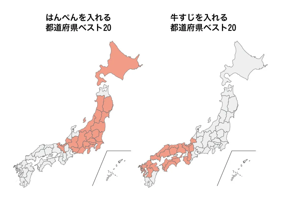 例えば、家庭での調理時間に着目し、その長さが本州の中央部に位置するフォッサマグナを境に異なることがわかります。西日本では牛すじを使ったおでんが一般的で、その調理時間はおよそ72.1分。対照的に東日本では48.4分と、約1.5倍の違いが見られます。この調査から、地域の食文化がどのようにおでんに表れているのかが明らかになりました。