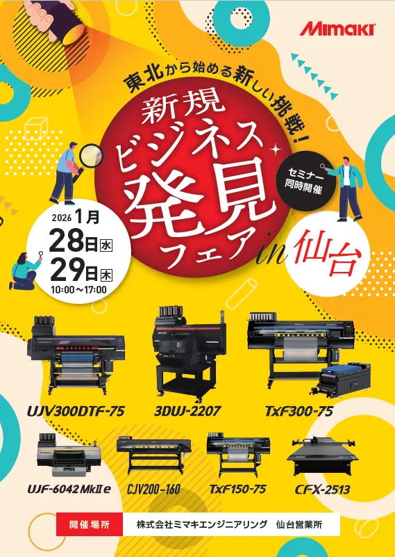 セミナーは1月28日(水)の13時から14時45分まで開催されます。また、展示会は同日に午前10時から午後5時まで、そして1月29日(木)も同じ時間帯でオープンします。会場は、株式会社ミマキエンジニアリング仙台営業所で、所在地は宮城県仙台市若林区古城3-10-7となります。