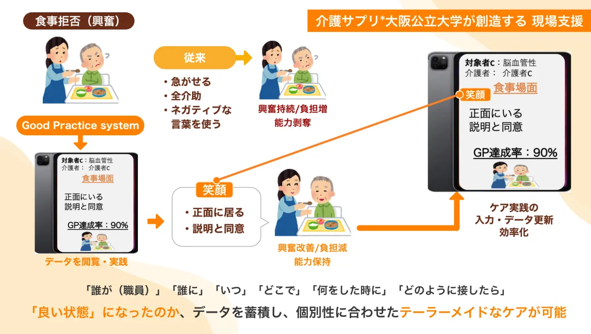 Good Practice Systemは、株式会社介護サプリが大阪公立大学と共同で開発を進めているシステムで、現在は兵庫県内の2つの法人で実証実験が行われています。介護者がケア記録アプリに介助内容を入力することで、AIが介護者と被介護者の関わり方に関するデータを蓄積し、それを元に個々の利用者に最適なアプローチを即座に提案します。この機能により、経験に依存せず、質の高い個別ケアが提供できるようになることが期待されています。
