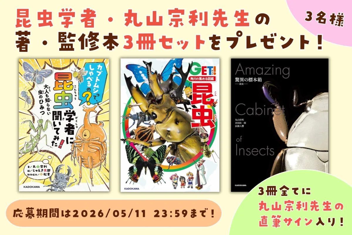株式会社KADOKAWAが2026年3月26日(木)に発売する最新刊『カブトムシって、しゃべるの? 昆虫学者に聞いてみた! 大人も知らない虫のひみつ』のリリースを記念して、特別なキャンペーンを実施しています。このキャンペーンでは、昆虫学者として知られる丸山宗利先生の直筆サイン入りの関連書籍3冊セットが抽選で3名に当たるという貴重なチャンスです!