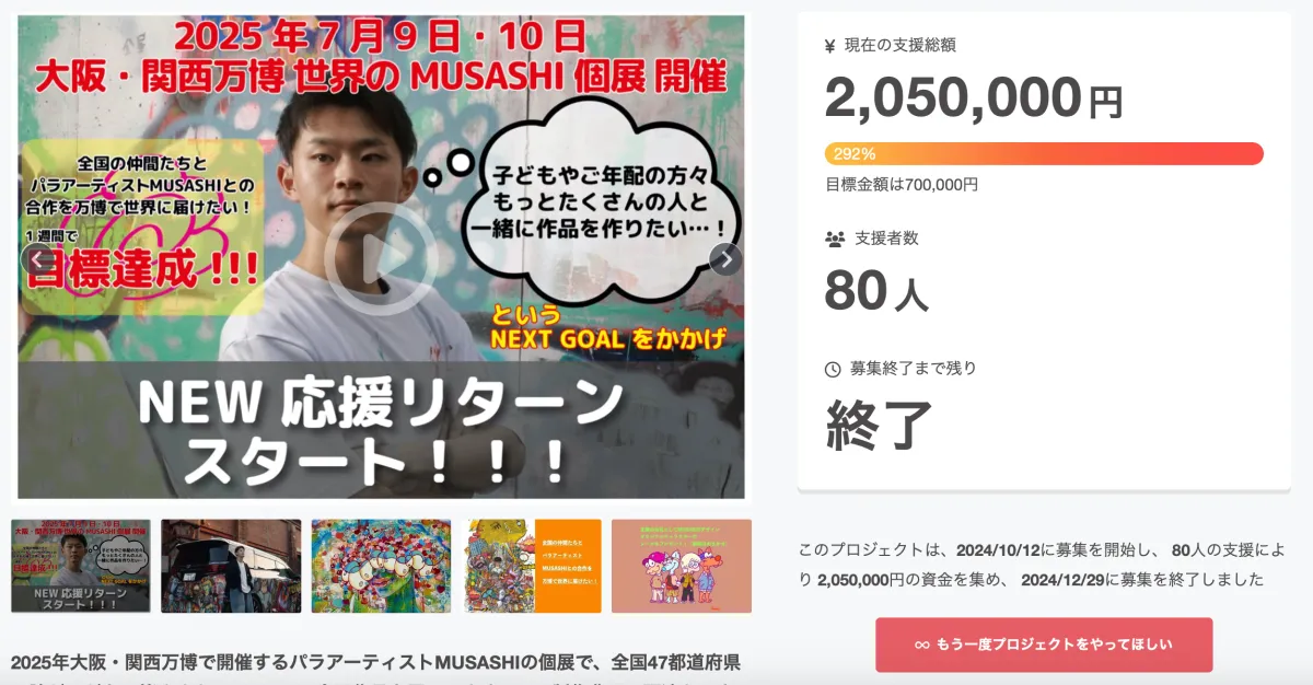 先日、パラアーティストMUSASHIによる特別なプロジェクトが大成功を収めました。彼は、2024年に開催される「大阪・関西万博」での「世界のMUSASHI個展」に向け、全国からの支援を受けたプロジェクト『全国の仲間たちとパラアーティストMUSASHIとの合作を万博で世界に届けたい!』に取り組んでいました。 遂に、目標金額の292%にあたる金額を達成し、集まった支援金は205万円。これは、期待以上の結果であり、多くの方々の思いを背負った成果です。プロジェクトの途中経過を支援者と共有するためのInstagramアカウントも設けられ、そこで活動の最新情報が随時発信されています。