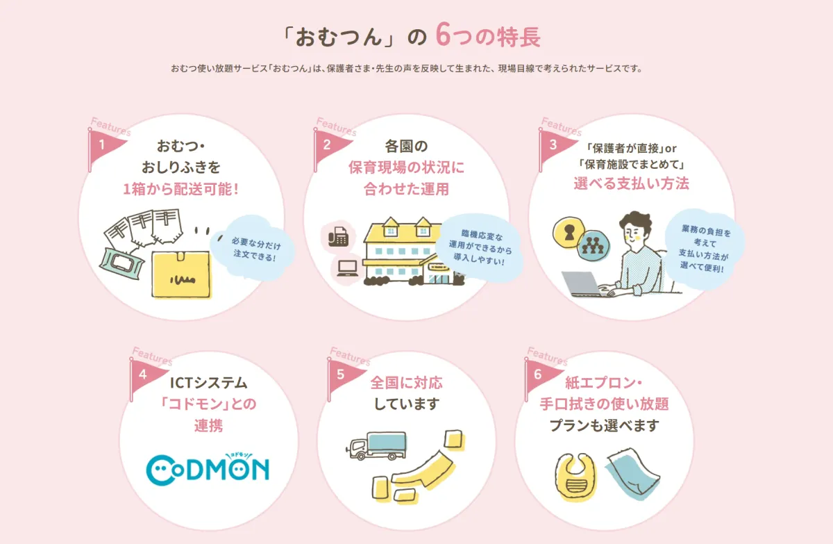 「おむつん」は、全国の多くの保育施設で利用されている画期的な紙おむつ・おしりふきのサブスクリプションサービスである。保護者は月額料金を支払うことで、おむつやおしりふきが使い放題になる。この仕組みにより、保護者は毎日おむつに記名して持参する手間を省くことができ、保育士はおむつの選別や管理にかかる負担が軽減される。