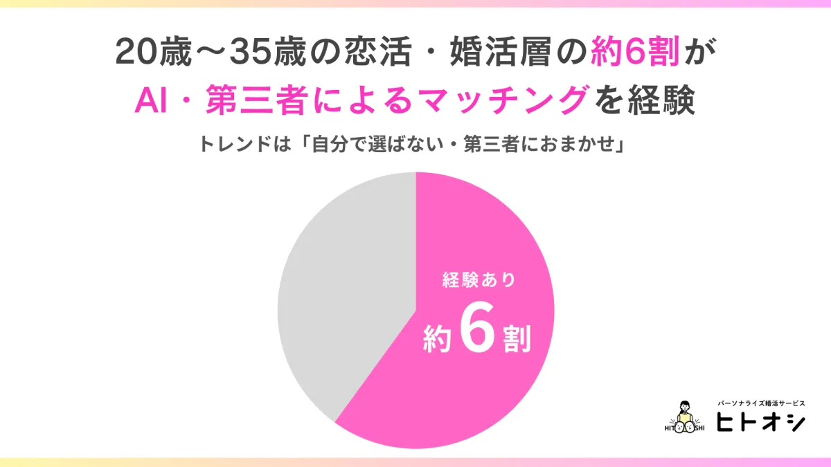 近年、恋愛や結婚を目的とした出会いの場として、「マッチングアプリ」が広く普及しています。特に都市部に居住する20歳から35歳の恋活・婚活層は、このサービスを活用する傾向が強いことがわかりました。株式会社Parasolが実施した調査によると、対象の約6割がAIや第三者に相手選びを委ねた経験があるとのことです。
