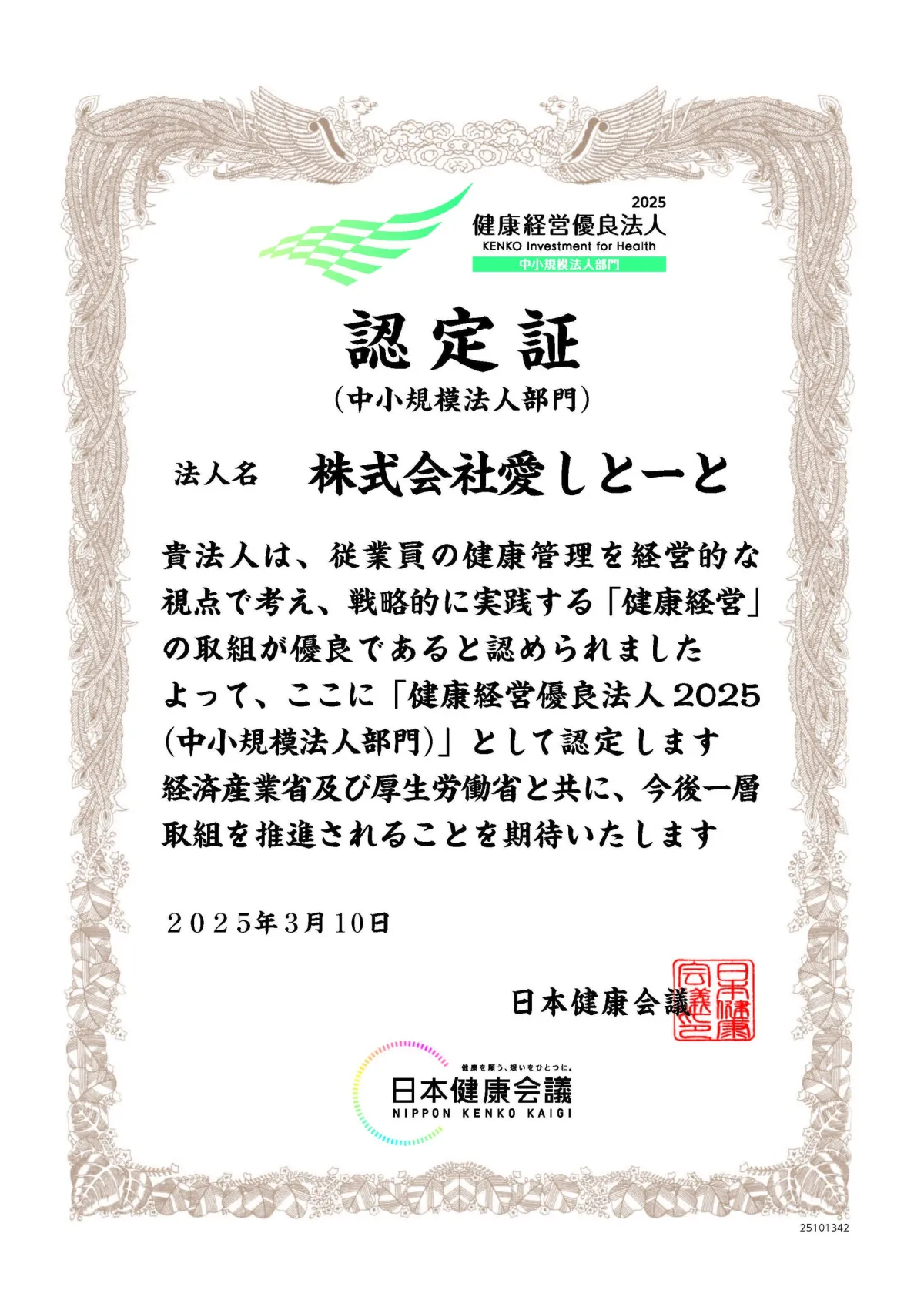 健康経営優良法人の認定は、企業の先進性や安定性を数値で示す信頼性の高い指標です。今後も社会全体の健康向上に影響を与え続ける株式会社愛しとーとのさらなる活躍に期待が高まります。