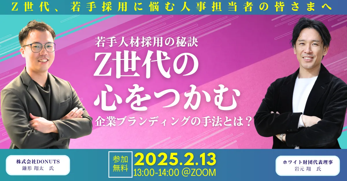 このウェビナーでは、株式会社DONUTSのプロダクトマネージャーである鎌形翔太氏と、ホワイト財団の代表理事である岩元翔氏が登壇し、若手人材に選ばれる企業になるためのブランディング戦略について探求します。具体的には、どうしたらZ世代を惹きつけ、企業ブランディングに繋げるかといったヒントが提供されます。内容は非常に実務的で、企業の現状を踏まえた具体例や成功事例も紹介される予定です。参加することで、自社の採用戦略を根本から見直す大きなきっかけになるでしょう。