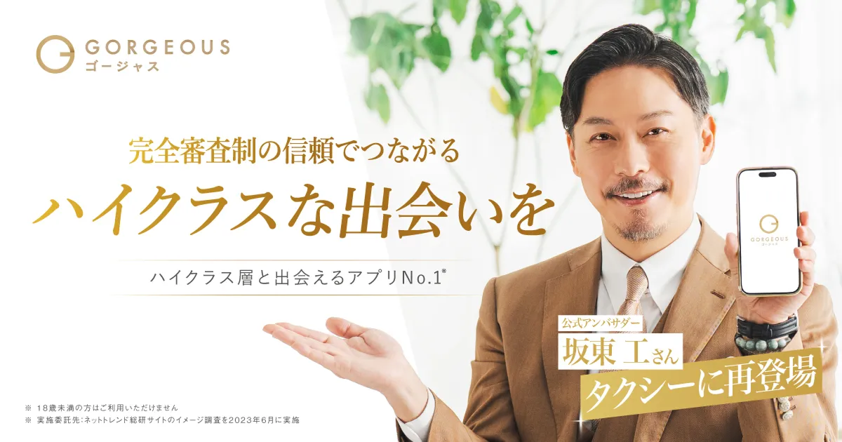 4月6日から、東京都内のタクシー車内で流れる「ゴージャス」の新たなブランド広告がスタートします。この広告には、公式アンバサダーである坂東工さんが再び登場。彼が伝えるのは、ハイクラスな出会いを実現する「ゴージャス」の魅力です。