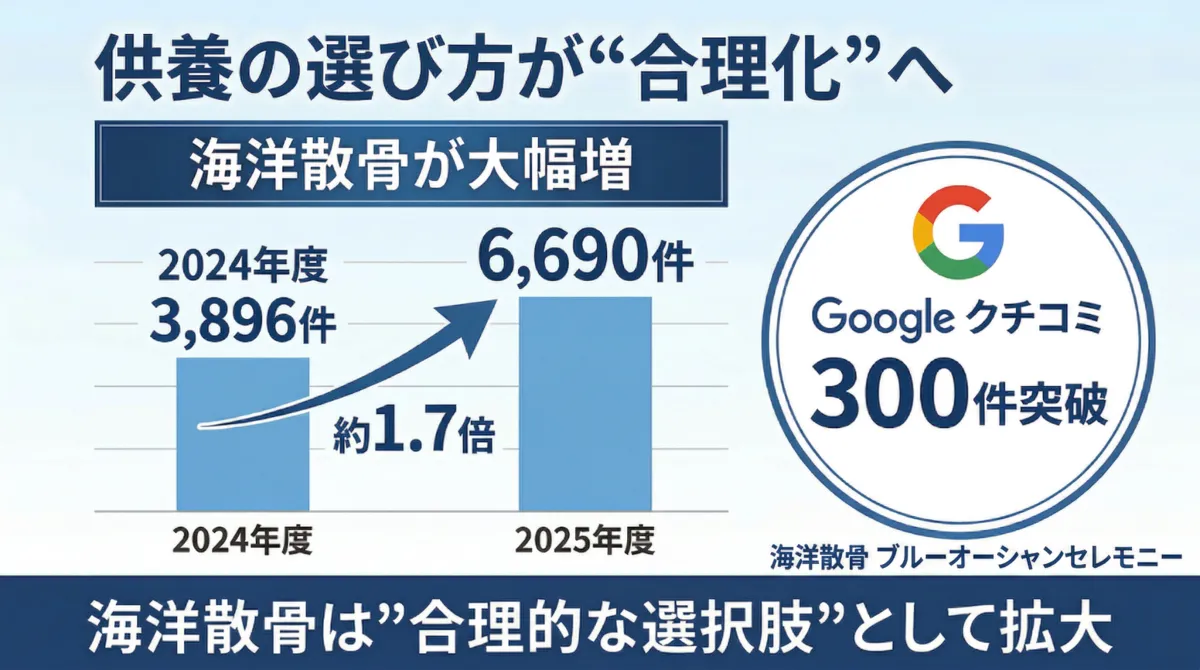 さらに、業界内の調査でも「業界No.1」の評価を受けており、その信頼性は客観的にも証明されています。このように、海洋散骨が一般の人々にとって身近な選択肢となりつつある現状は、社会全体の供養の在り方を変える大きな一歩です。