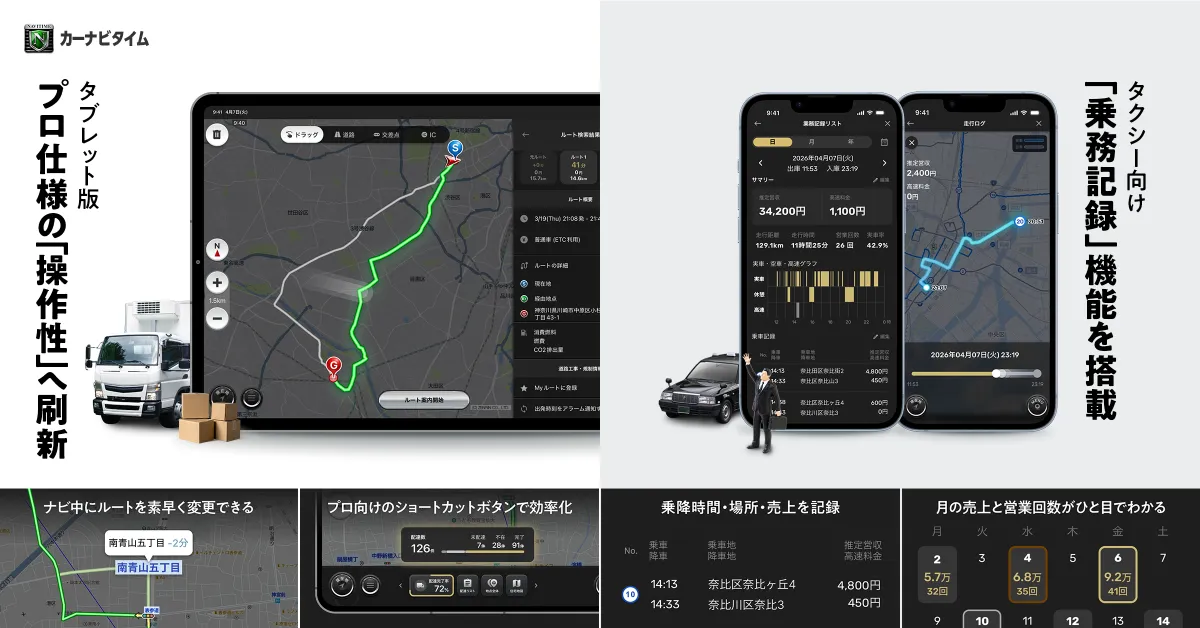 株式会社ナビタイムジャパンが、2026年4月17日より、タブレット版『カーナビタイム』のユーザーインターフェース(UI)を大幅にリニューアルすると発表しました。新機能として、プロドライバー向けのショートカットボタンや、タクシードライバー向けの「乗務記録」機能を加え、使い勝手を向上させています。これにより、多忙な現場で求められる迅速な対応が可能になります。