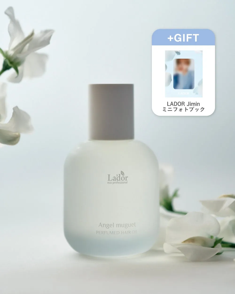 特別セットには、パフュームヘアオイル エンジェルミュゲの80mlと10mlが含まれており、さらにスズランチャーム(ホワイトまたはイエローから選べる)とJiminのミニフォトブックが特典として付属します。