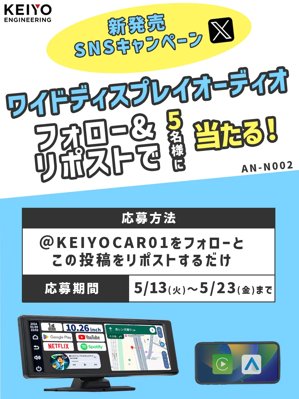 乗車中のエンターテイメントを向上させるワイドディスプレイオーディオAN-N002をはじめ、慶洋エンジニアリングの製品は、現代の車内生活において欠かせない存在となりつつあります。キャンペーン期間中の応募をお忘れなく!