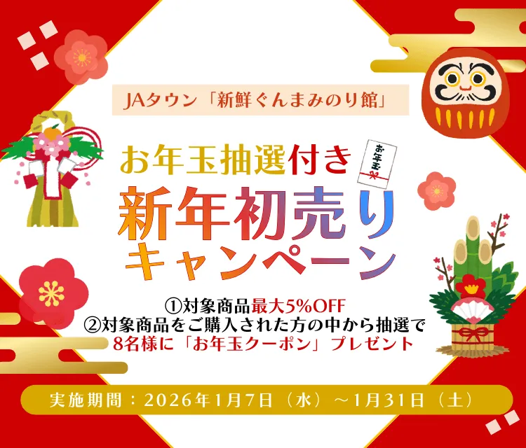 群馬県の特産品を楽しめるショップ「新鮮ぐんまみのり館」が、JA全農が運営する産地直送通販サイト「JAタウン」で新年の初売りキャンペーンを実施します。このキャンペーンでは、約100種類の対象商品が3%から5%割引となるほか、購入者の中から抽選で「お年玉クーポン」がプレゼントされるという嬉しい特典が付いています。