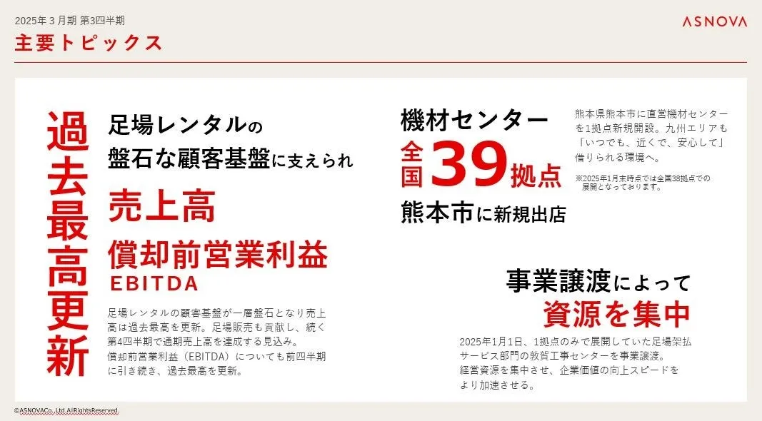 2025年2月14日、株式会社ASNOVAが2025年3月期の第3四半期決算を発表しました。当社は、くさび式足場のレンタルと販売を手掛け、特に足場レンタル事業においての盤石な顧客基盤が強みです。この四半期は、売上高が過去最高を記録したことが特筆されています。