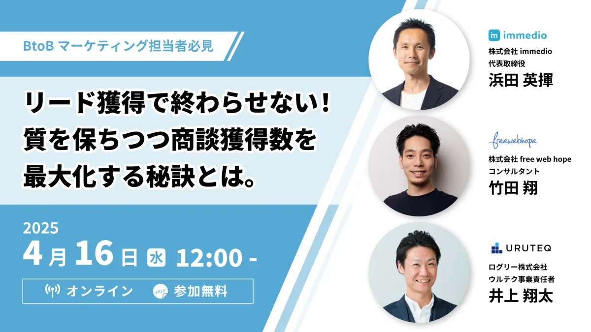 このウェビナーは、「リード獲得で終わらせない!質を保ちつつ商談獲得数を最大化する秘訣とは。」というテーマで進行されます。開催日時は、2025年4月16日(水)12:00から13:00まで。オンラインで参加可能で、事前の申し込みが必要です。