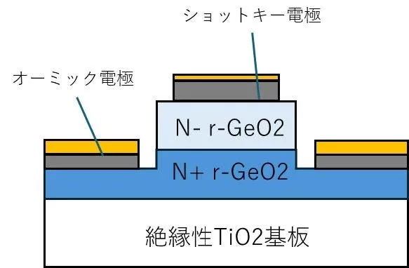 PATENTIXの成功は、特許出願中の技術に基づいたものです。N+層のr-GeO₂上にドナー不純物濃度1×10¹⁷[cm⁻³]のN-層を成膜することに成功し、国立研究開発法人物質・材料研究機構(NIMS)との共同研究により、世界初のショットキーバリアダイオードの動作に成功しました。具体的には、絶縁性のTiO₂基板にN+層を形成し、その上にN-層を重ねて電極を作り、疑似縦型構造のSBDを完成させたのです。この構造により、驚異的なON/OFF比7桁の整流特性を確認しました。