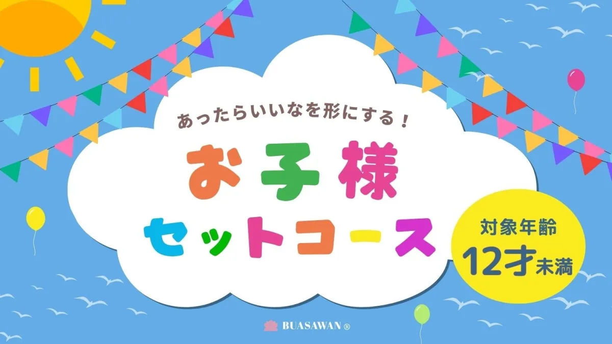 このコースは、12歳未満のお子様を対象にしたもので、施術内容にはタイ古式マッサージやオイルマッサージ、頭マッサージ、足ツボマッサージが含まれています。施術時間は60分で、料金は15,300円(税込)。施術後にはBUASAWANオリジナルのおもちゃがプレゼントされる特典も用意されています。