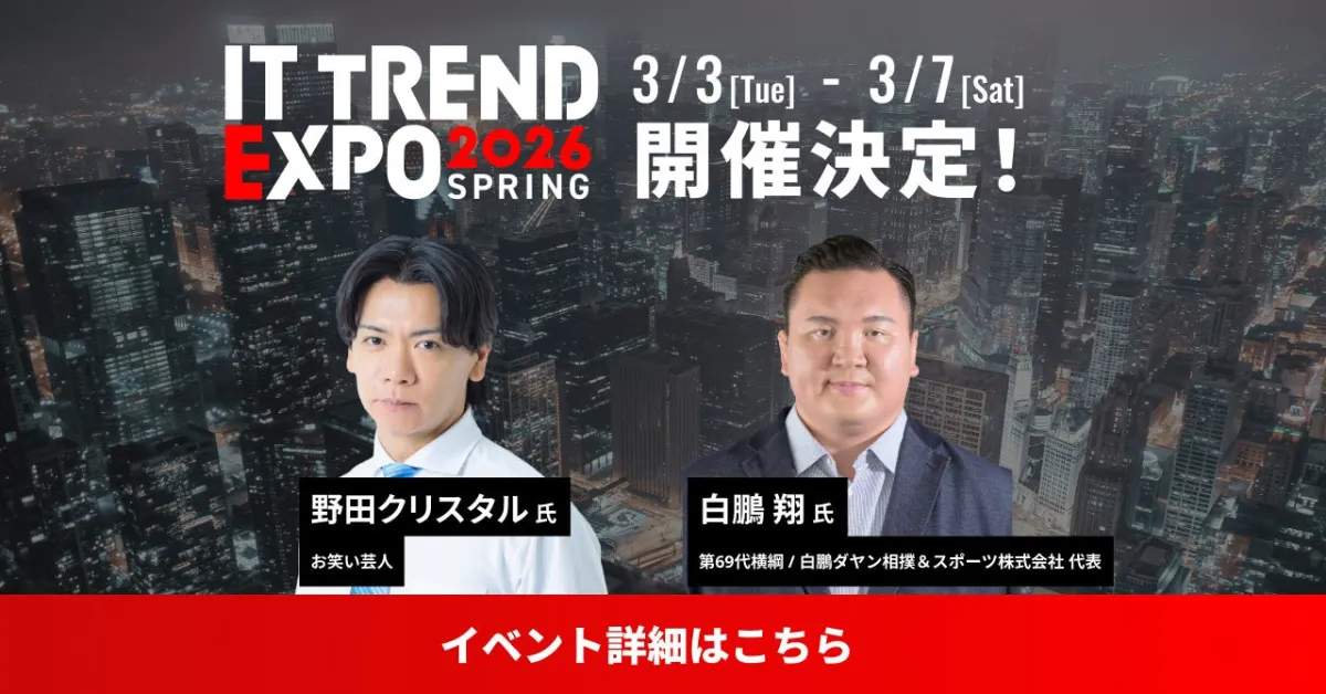 2026年3月3日(火)から7日(土)までの5日間、業界最大級のオンライン展示会「ITトレンドEXPO2026 Spring」が開催されます。本イベントには、マヂカルラブリーの野田クリスタル氏や、第69代横綱の白鵬翔氏など、豪華な特別ゲストが登壇します。