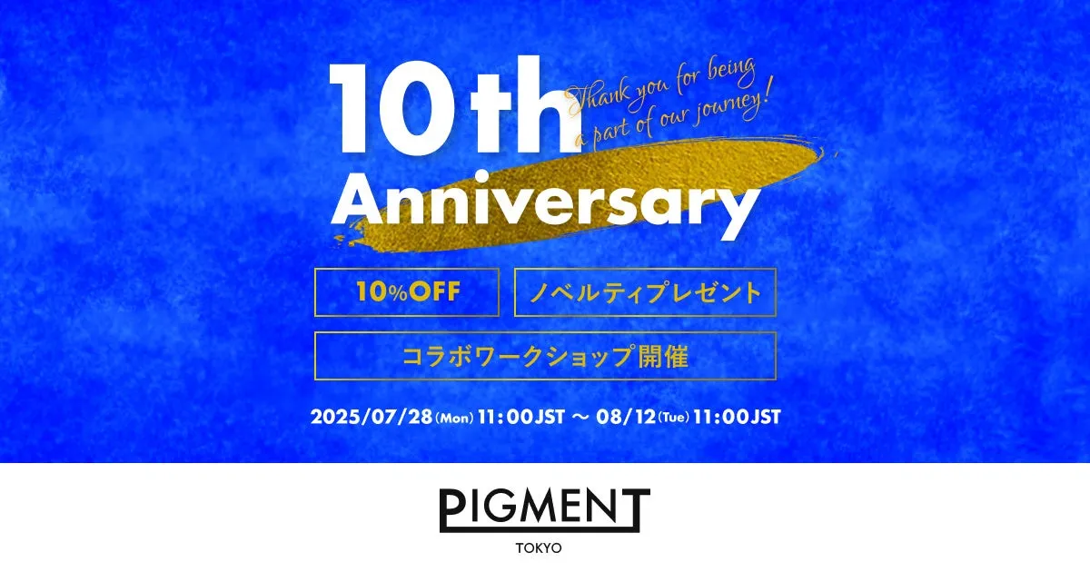 東京都品川区に位置する画材ラボ「PIGMENT TOKYO」が、2025年7月27日の開業10周年を記念して、感謝の気持ちを込めた特別なキャンペーンや、オリジナル面相筆プレゼント、さらには老舗画材メーカーとの限定ワークショップを実施します。
