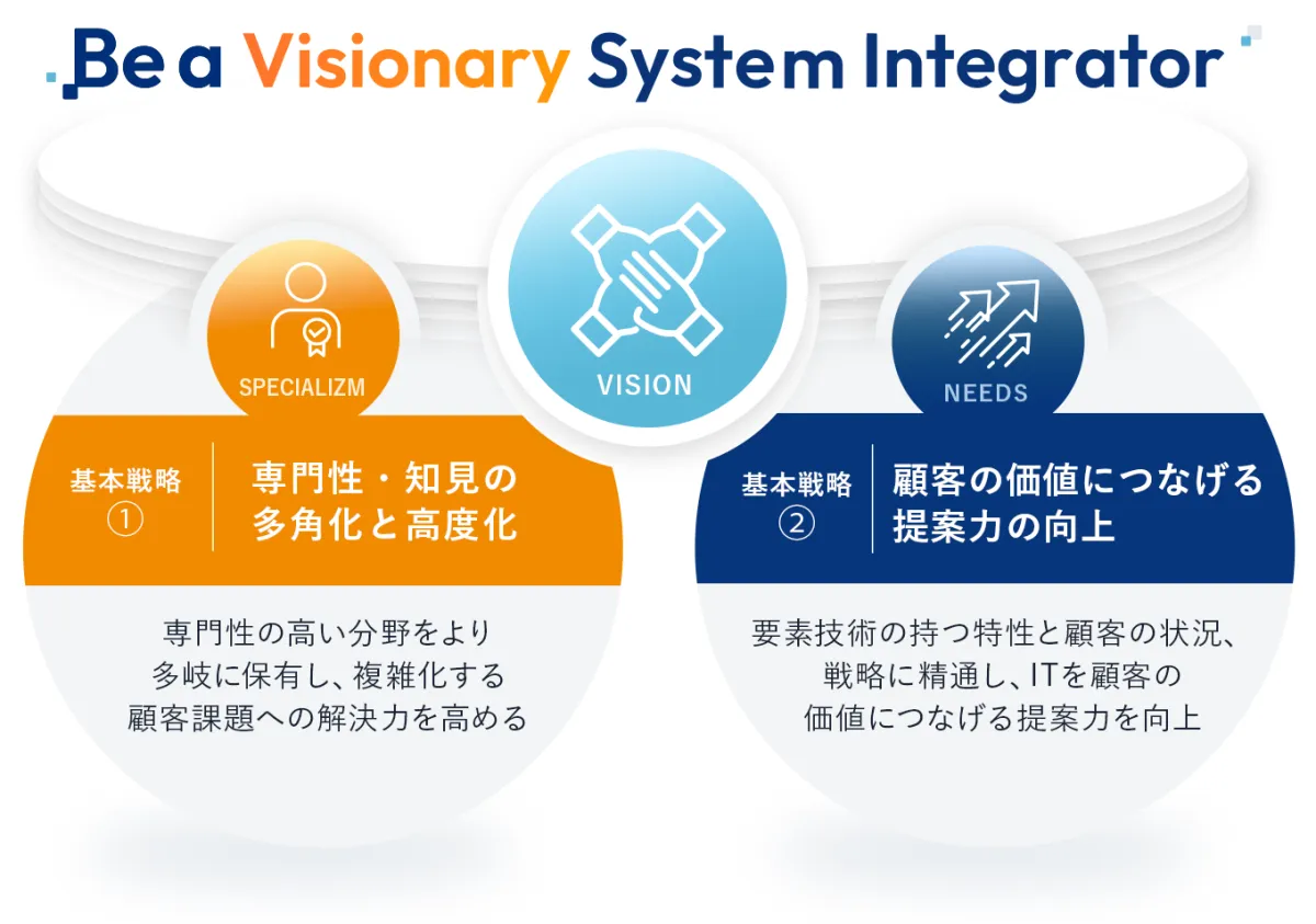 「Be a Visionary System Integrator」とは、未来指向であり、技術力を活かして価値あるサービスを提供する存在として、お客様にとってのかけがえのない存在であり続けることを意味します。このエネルギーが、今後の会社の成長を支える原動力となるのです。