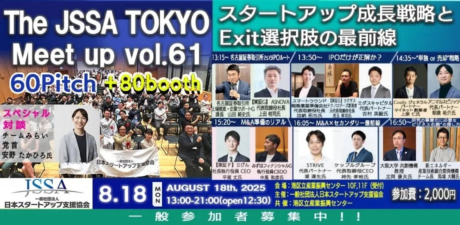 2025年8月18日、東京で特別なイベント「THE JSSA TOKYO Meetup Vol.61」が開催されます。このイベントでは、スタートアップ、M&A、そしてセカンダリー市場に焦点を当てた多彩なプログラムが用意されています。特に注目は、チームみらいの党首、安野たかひろ氏の登壇です。彼は、有名なAIエンジニアであり、スタートアップの成功事例を数多く持つ実績ある人物です。安野氏のトークセッションでは、スタートアップと政治の交差点について掘り下げ、未来へのビジョンを語ります。