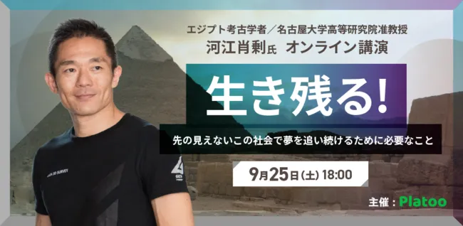 9月25日(土)、エジプト考古学者の河江肖剰氏によるオンライン講演「生き残る!〜先の見えないこの社会で夢を追い続けるために必要なこと」が開催される。この講演は、アスリートや研究者の知識を広めるオンラインプラットフォーム「Platoo」が主催している。