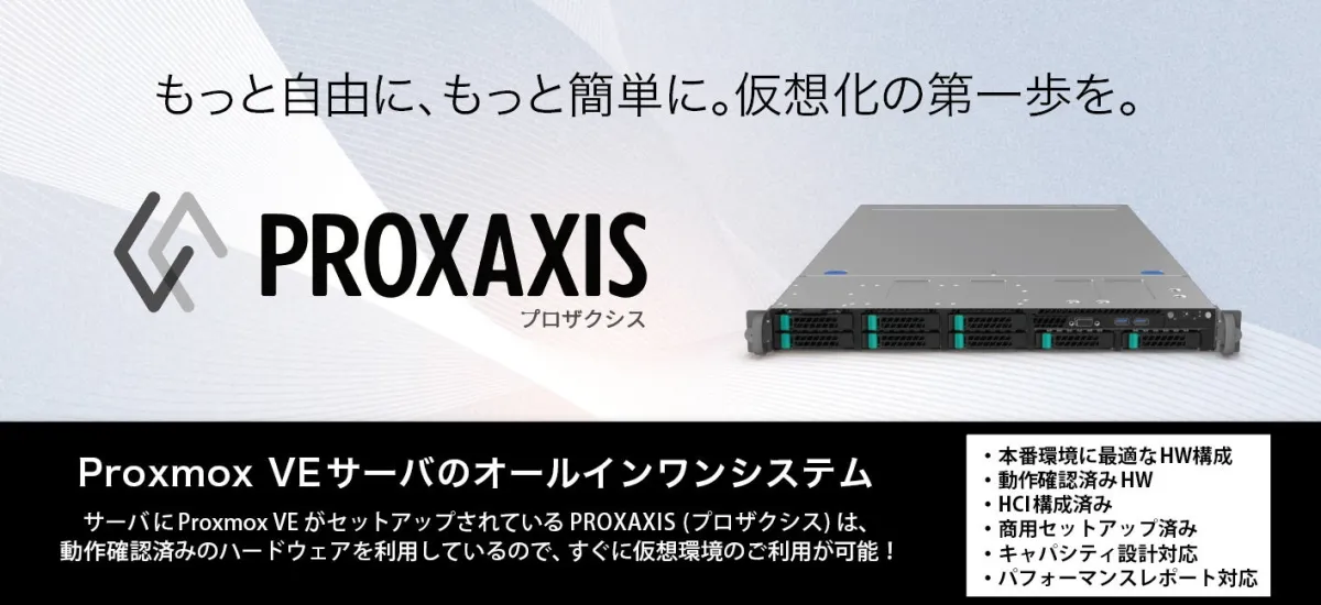 株式会社アクシスは、仮想化基盤ソリューション「Proxmox Virtual Environment(Proxmox VE)」をプレインストールした新ハードウェアソリューション「PROXAXIS(プロザクシス)」を発表しました。これは企業向けに設計された国内初のオールインワン仮想化ソリューションであり、迅速かつ安定した環境の構築と運用を可能にします。