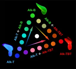 しかし、NIMSの研究者たちは新たな手法を発見しました。それは、異なる色のアルキルπ液体を均一に混合することで、混合比を変えるだけで希望する蛍光色を得るというものです。具体的には、赤、青、緑の三色からなる蛍光を、それぞれのアルキルπ液体を合成し均一に混合することで実現しました。これにより、これまでの技術では得られなかった精度で、様々な色の蛍光を制御することが可能になりました。