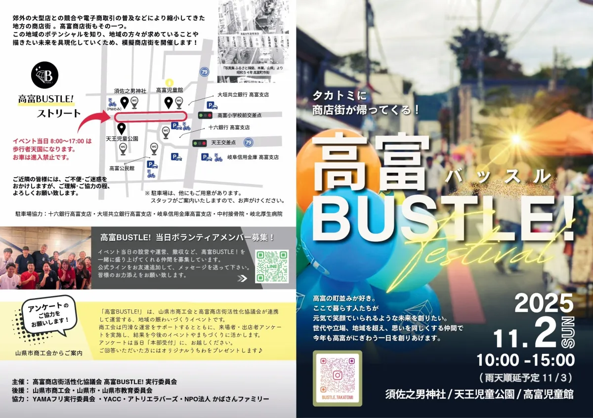 岐阜県山県市で、昨年3,000人を集めた人気イベント『高富BUSTLE!』が今年も開催されます。主催は高富商店街活性化協議会と高富BUSTLE!実行委員会で、委員長を務めるのは田崎豪さんです。このイベントは、地域の商店街をリノベーションし、活気を与えることを目的にしたもので、昨年は地元の人々の熱意が集まり、成功を収めました。