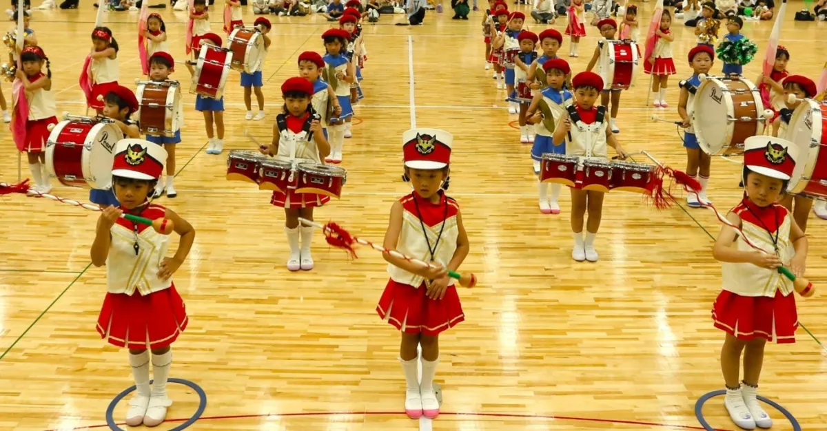運動会の目玉は、年長組によるマーチングバンドのパフォーマンスです。彼らは4月から、スローガン「よく見る・よく聞く・よく考える」「みんなの気持ちを一つに」を掲げ、半年間にわたり入念に練習を重ねてきました。華やかな衣装を身にまとい、楽器隊に加えて色鮮やかなカラーガードも参加する中、園児たちは「うちゅうにムチュー」と「にじいろ」の2曲を披露しました。隊形を変えながら、観客を楽しませる演出が施されたこのパフォーマンスは、参加者全員の心に深く刻まれました。