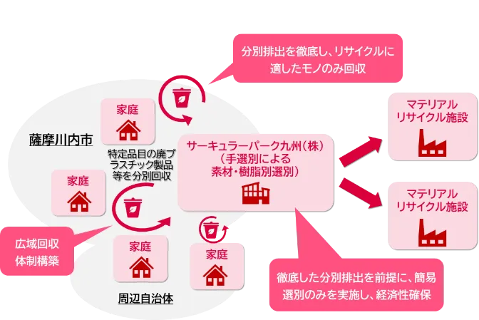 中小地域での実証事業は、例えば鹿児島県薩摩川内市が想定されています。この地域では、家庭からの廃棄物が多く、地域コミュニティが強いため、住民の資源分別への参加意識を高めることが可能です。住民による丁寧な分別が行われることで、不要な選別工程を省力化し、リサイクルが進む見込みです。また、近隣の複数の自治体と協力することで、広域にわたる効果的な回収が期待されます。