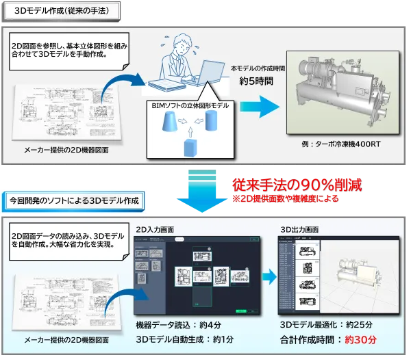 建設業界では、設計・施工フェーズでのBIM(Building Information Modeling)やICT(Information and Communication Technology)の導入が進んでいますが、ボイラーや冷凍機といった大型設備に関する3Dモデルが市場に出回っていないのが現状です。このため、ユーザーは自ら時間をかけてモデルを作成する必要があり、1台あたり約2~7時間もかかっていました。この inefficiency が長年にわたり業界の生産性を圧迫してきたのです。